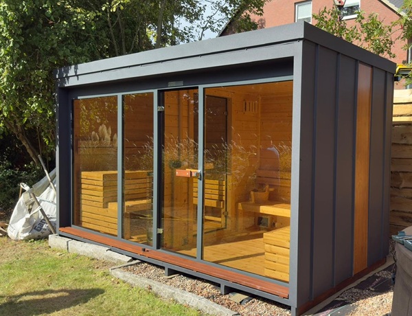 Eine moderne Gartensauna setzt auf cleane Optik und Komfort: