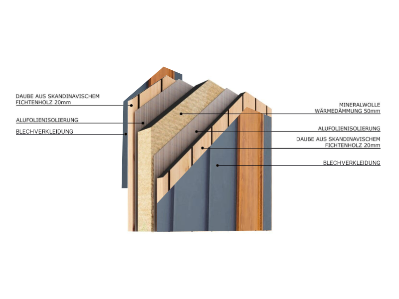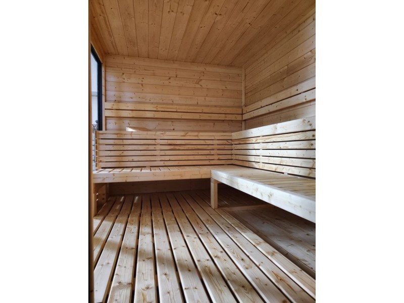 - Wood cladding: Scandinavian spruce, 20 mm boards (inside & outside)