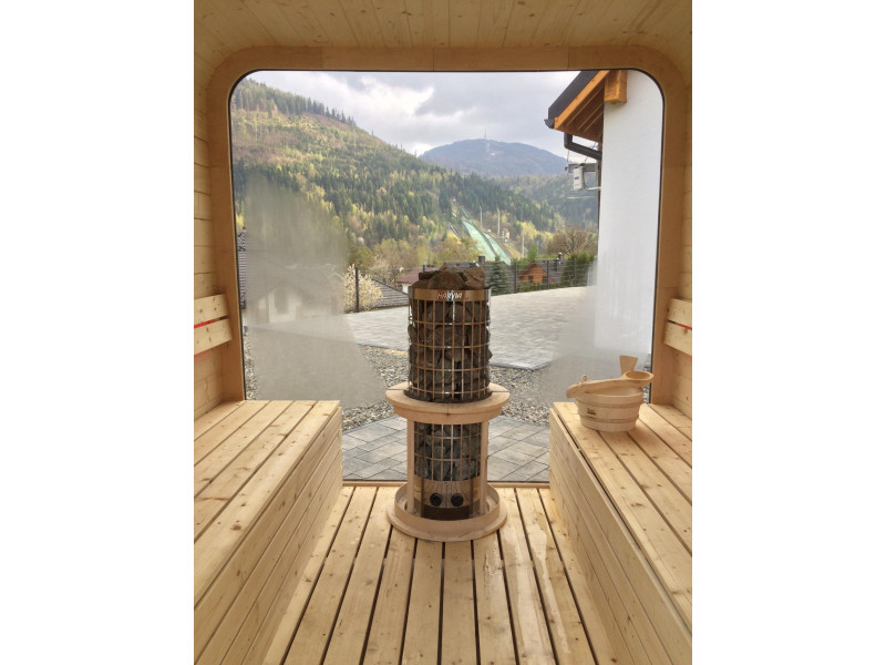 - Heating options: Harvia wood stove with chimney (BImSchV 2 compliance available) or Cilindro 9 kW electric stove with WiFi BleBox, including sauna stones