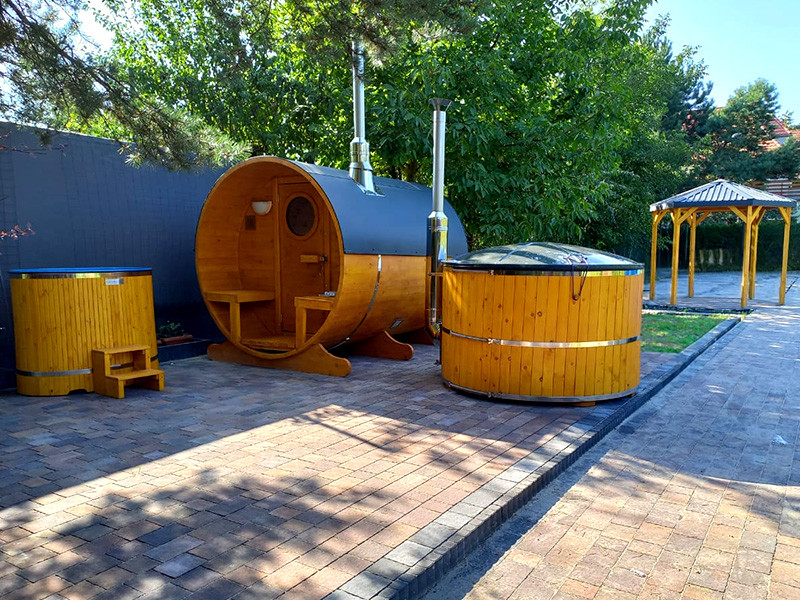 Model DISCOVERY SO-2m, available fully pre-assembled with a HARVIA M3 or Cylindro 9kW sauna heater (wood or electric) including chimney and sauna stones.