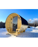 Model HORISONT 3.1m, available fully pre-assembled with a HARVIA M3 or Cylindro 9kW sauna heater (wood or electric) including chimney and sauna stones.