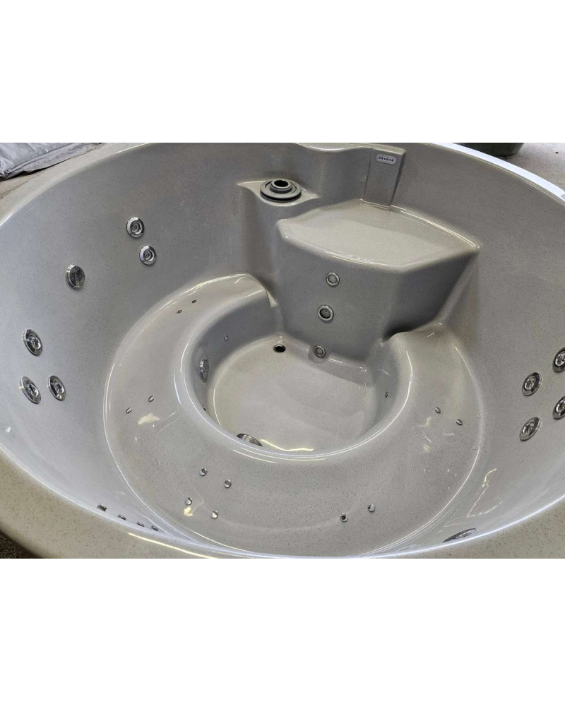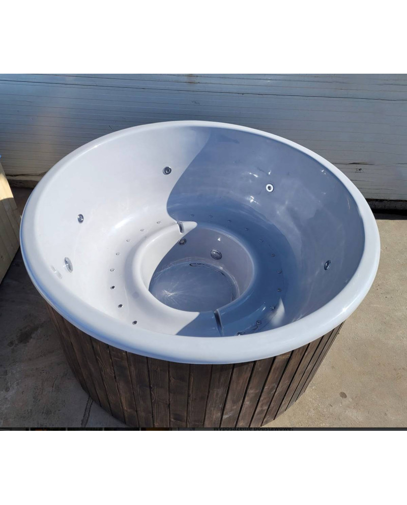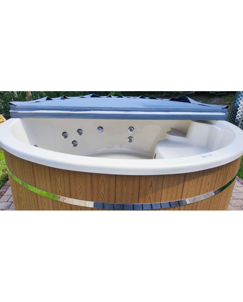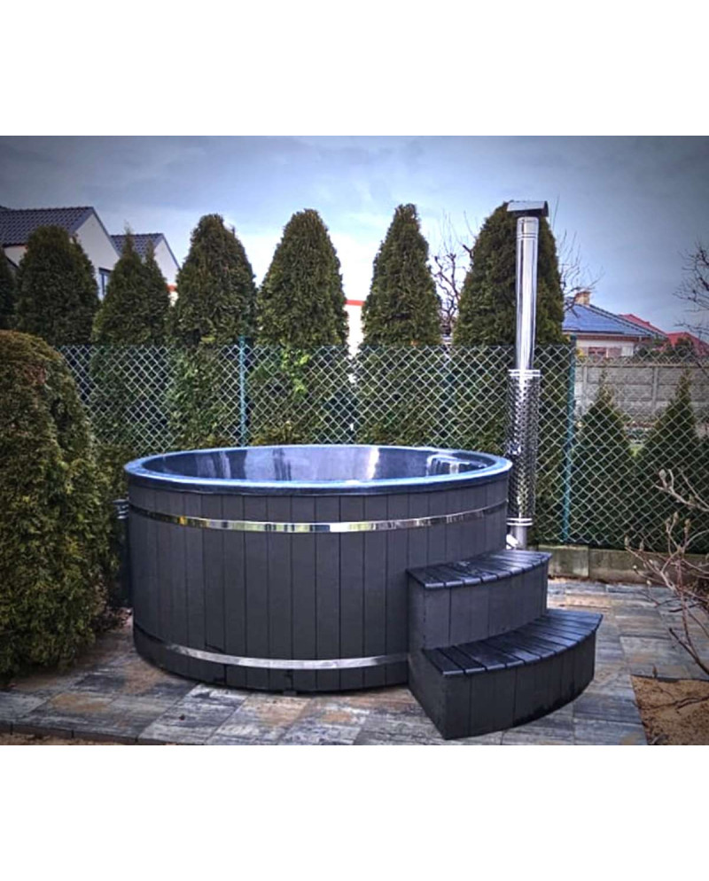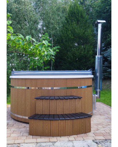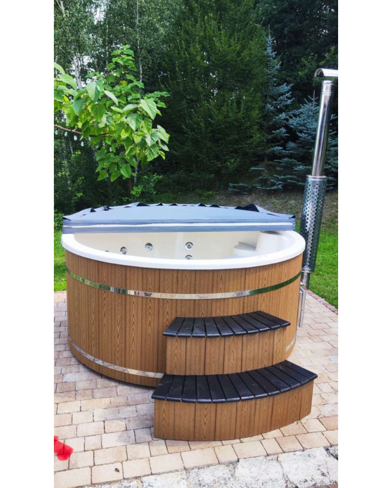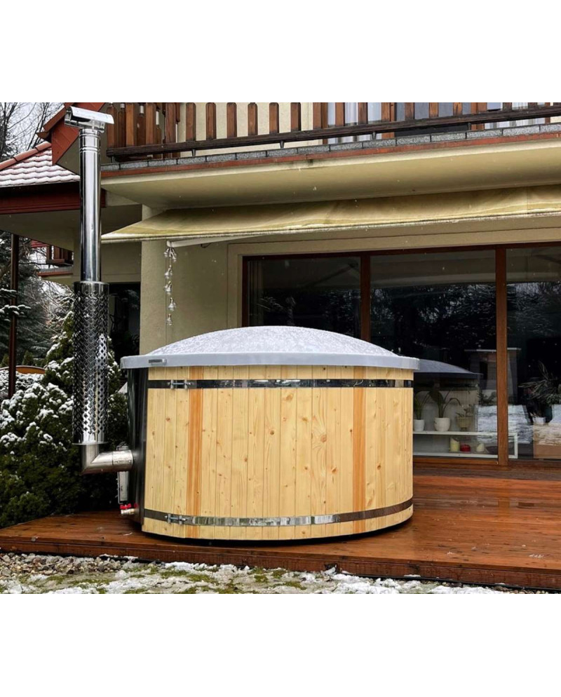 This stylish garden hot tub with an integrated wood stove is designed for year-round relaxation. Whether you want a warm bath in winter or a refreshing wellness experience in summer, this model creates a comfortable spa area right at home.