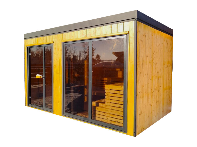 -Skelettkonstruktion der Sauna: Die Sauna ist in hochwertiger Skelettbauweise gefertigt und bietet optimale Stabilität sowie Wärmedämmung. Rahmenkonstruktion 100 x 50 mm, Wände sind mit 50 mm Mineralwolle gedämmt und mit einer Aluminium-Dampfsperre versehen.Die Innen- und Außenverkleidung aus 20 mm starker skandinavischer Fichte sorgt für ein natürliches, langlebiges und angenehmes Saunaklima.