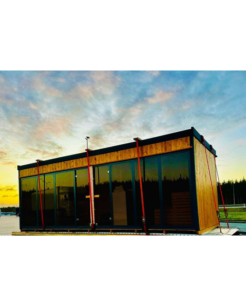 Die Sauna ist vormontiert erhältlich. Die Anlieferung erfolgt bis zur Bordsteinkante. Das Abladen sowie der Weitertransport zum Aufstellort sind vom Kunden selbst zu organisieren und durchzuführen – z. B. mit einem Stapler, Bagger oder Kran. Die Lieferung erfolgt innerhalb von 14 bis 16 Wochen nach Zahlungseingang. Die Transportkosten werden anhand Ihrer Postleitzahl mit 0,70 € netto pro gefahrenem Kilometer berechnet.